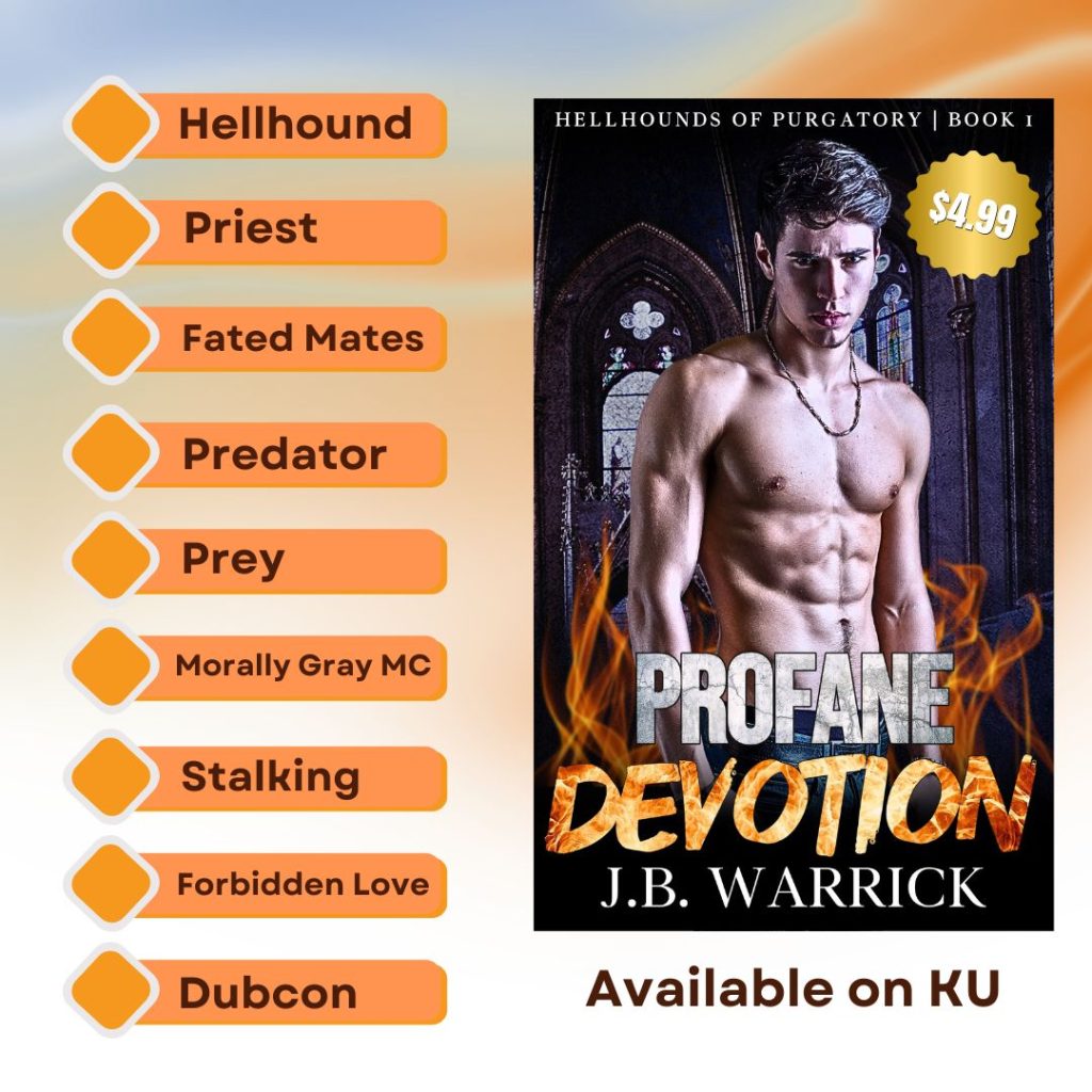 Profane Devotion is a 51k-word MM dark paranormal romance with a guaranteed HEA and no cliffhanger. It contains a morally gray hellhound shifter and the conflicted priest that falls for him. It has the steamy scenes and violence you might expect from a paranormal romance. It is the first in a series of interconnected standalones. Not suitable for readers under 18.